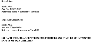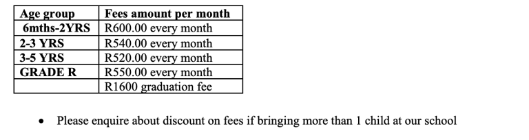 If a parent will not be able to fetch his/her child at 5:00 pm when the school is out, they can register their child for after care services which run from 5:00 pm-6:00 pm for R500.00 only per month (Paid at school not bank). Any child who is not registered for aftercare will pay a late penalty of R100.00 per day should the parent fetch the child from 5:01 pm, this money is to be paid at the same time when fetching the child.