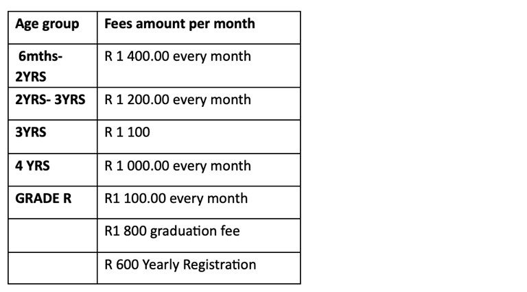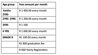 Every child coming to the school for the first time must pay a registration fee that is determined over time; registration fee for the year 2025 is R600.00 (payable at the bank) which is yearly.